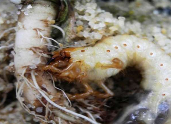 (图中所示为鳃角金龟的幼虫在侵食蒲公英的根部。来源:Meret Huber/德国马普化学生态研究所,PLOS生物学)