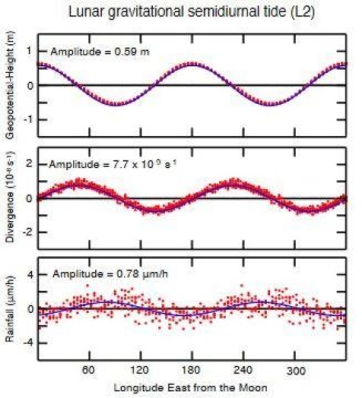 当月亮位于赤道正上方时,它会使得地球大气产生膨胀,这种膨胀导致降水量出现极为细小不易察觉的下降。