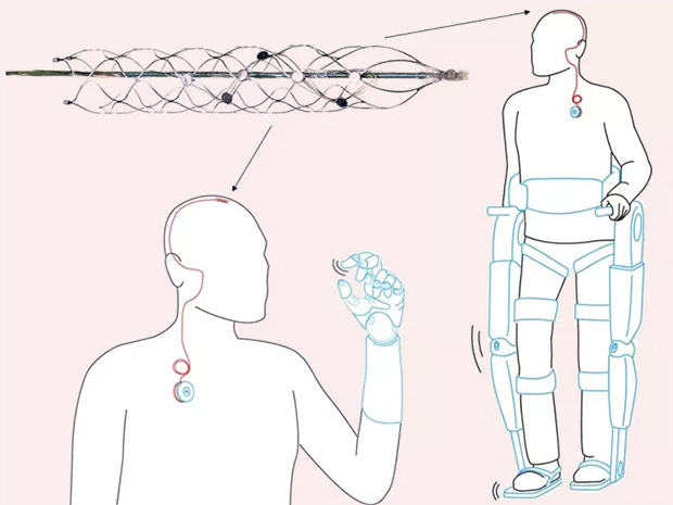 医生将一根导管经由颈部血管伸入脑血管,就能把该设备植入。设备收集电信号,通过颈部血管中的导丝传送至植入在胸肌上的信号发送器,后者发出的无线信号穿过皮肤,在体外被读取,用复杂的软件解码后就能用于控制外骨骼运动。
