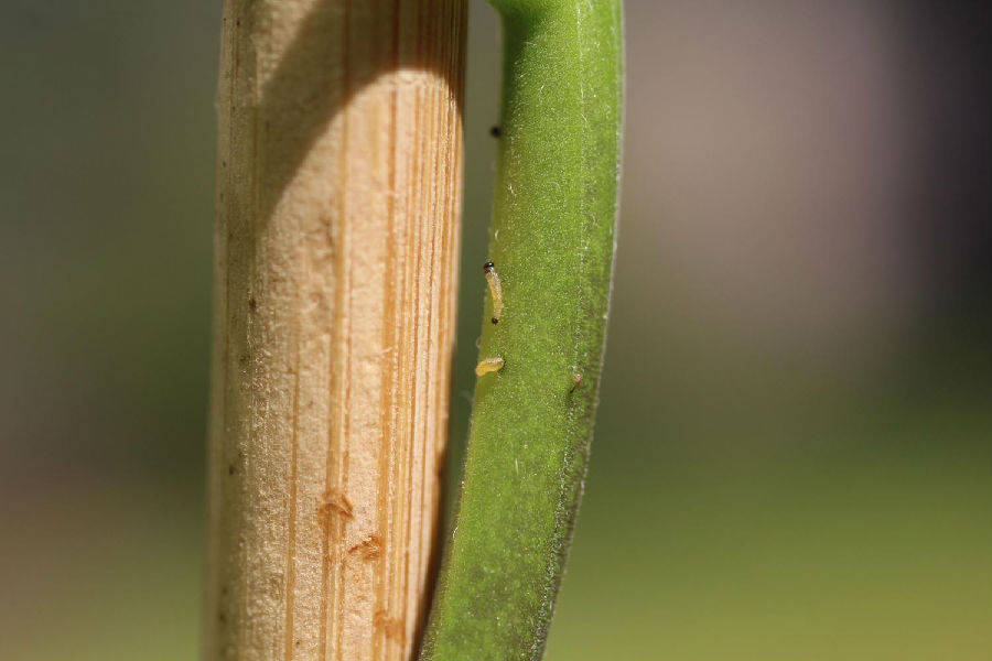 图为食草动物跳甲幼虫(Psylliodes dulcamarae,欧白英茄蚤跳甲)正试图进入茄科植物欧白英(Solanum dulcamara)的茎秆中。在这些幼虫张开嘴享用植物前,它们却猝不及防地被小红蚁驱赶出境。有趣的是,这些小红蚁的出现正是由于幼虫的父辈捕食植物所造成的,父辈对茄科植物的蚕食令它们分泌出蚂蚁无法抗拒的琼浆玉露。来源:Tobias Lortzing