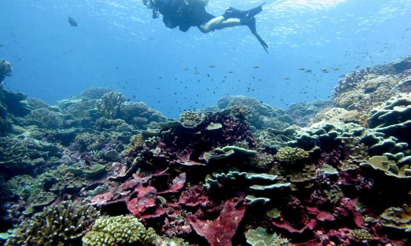 潜水员正在沿着莱恩群岛南部的千禧岛的珊瑚礁附近巡游。来源:Jennifer Smith