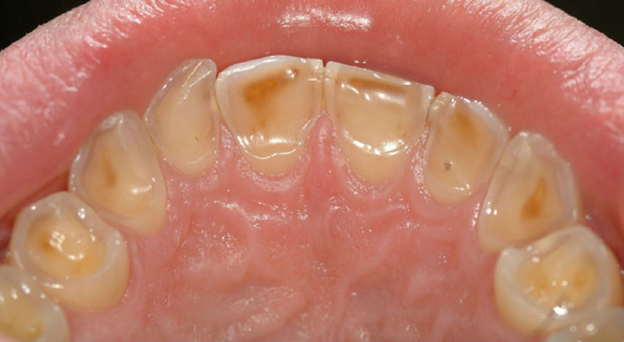 在牙侵蚀症的早期阶段,牙釉质表层会被侵蚀掉,而在后期阶段,就会使得较柔软的牙质甚至牙齿中央柔软的部分(牙髓)裸露出来。