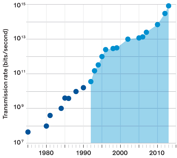 然而,尽管互联网泡沫在21世纪初破灭,但是全球用户对于带宽的需求从未减少。据Cisco公司最近发布的一份报告,全球互联网数据传输量在2010年至2015年之间增长了整整5倍,而这一趋势看上去仍然会继续,主要是因为网络视频和物联网的发展。