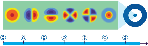 不同模式的信号,即不同的空间分布形式,可以用来在同一根光纤中传输多个信号,从而提高信号容量,某一模式中,光纤横截面上不同区域的光密度不同。如图中上方所示是一根光纤中可以存在的信号模式,而图中下方显示随着传输距离增加,不同模式之间可能会发生振荡而互相干扰。