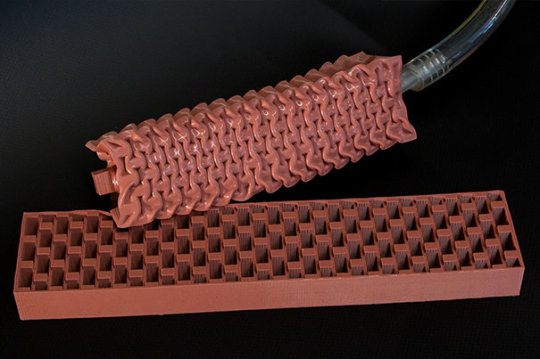 包含软橡胶或人造橡胶的执行装置充满了像蜂巢那样的小型空腔。施加真空环境之后,空腔萎缩,整个执行装置随之收缩,产生动作。定制而成的内部蜂巢结构可以进行线性、转动、弯曲或组合运动。