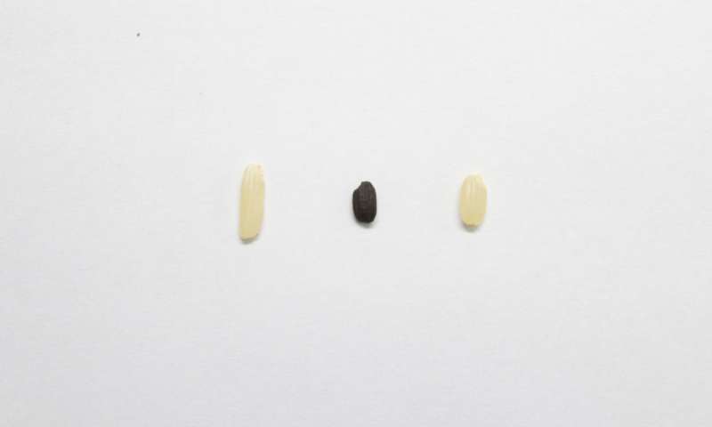 对遗存的古代水稻和现代水稻的比较。图片中是未去壳的、去壳的和磨碎的大米,左边是籼稻,中间的是古代水稻,右边是粳稻。来源:Masahiko Kumagai