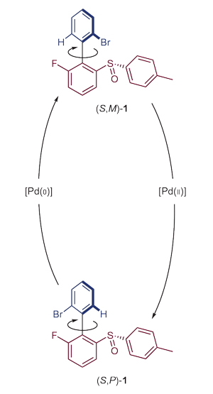 新系统需要在不同的条件下,通过四步反应,使环旋转。其中,碳氢键的活化和氧化加成反应依赖于钯催化剂。在该反应中,钯配合物结合于芳烃之间的旋转轴上。其中,有两个关键的反应步骤。在这两个步骤中,位于分子上面的环相对于下面的环每步旋转180°,进而驱动化合物的旋转。“这项研究开启了催化体系中的旋转马达系统研发之路,”Feringa评论道。“我们下一步打算建立一个化学燃料系统。”