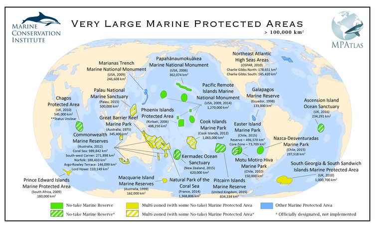 这个故事听起来很熟悉?因为去年英国在皮特凯恩群岛(Pitcairn Islands) 周围刚刚建立了世界上最大的连续海洋保护区,2016年1月又在阿森松岛(Ascension Island)周围设立了另一个巨大的保护区。智利、法国和新西兰也都在过去的几年中采取了类似的举动,他们将极偏远的岛屿周围海域(如复活节岛 Easter Island)也变成了大型的自然保护区。
