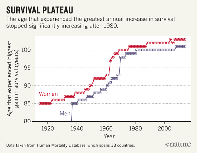 为了研究这个问题,纽约的爱因斯坦医学院(Albert Einstein College of Medicine)遗传学家Jan Vijg及其同事开始着手于人类死亡数据库(Human Mortality Database)的分析。这个数据库包含38个国家的数据,是由美国以及德国的人口统计学家共同管理的。他们认为,如果不存在寿命的上限,那么随着时间的流逝以及药物的发展,最大寿命应该不断攀升。但是与此相反,他们发现自20世纪早期开始,最大寿命确实节节高升,但是到了1980年就达到了平台期,当时的最大寿命长期保持在了99岁(此后的最高寿命纪录增幅非常小)
