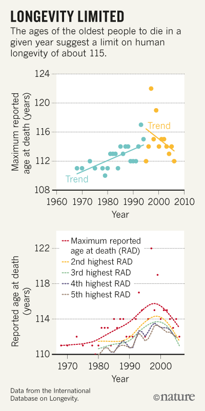 研究人员们紧接着查看了国际寿命数据库(International Database on Longevity),该数据库由一个国际团队负责运营,主要关注最长寿人群的数据。他们发现法国、日本、美国以及英国(超级人瑞最多的国家)被记录的最大死亡年龄——即给定的某一年里去世的人中的最大年龄——在1970至20世纪九十年代早期快速增长,但是在九十年代中期起就进入了平台期,最大死亡年龄维持在114.9岁。当研究人员分别观察给定年份中第二、第三、第四、第五大的死亡年龄时,他们发现了同样的趋势。他们又追踪了另一个由国际老年学研究组织(international Gerontology Research Group)管理的数据库。Vijg的团队得到的结论是人类的自然寿命存在一个最高上限——约为115岁。偶尔会有Calment这样的人可能打破这一极限,但据研究者们估计,无论何时人们活过125岁的概率都小于万分之一。