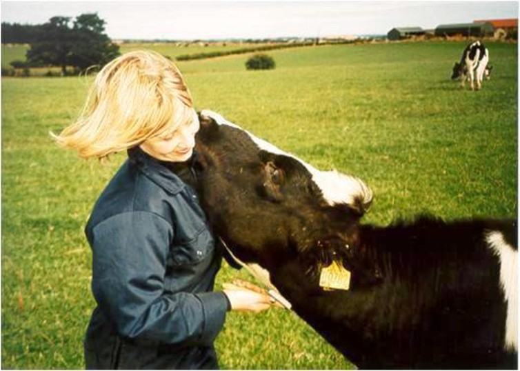 为了发展人与动物之间的关系,动物必须不怕人,而且在它们与人相处的时间中必须有较高比例的积极体验。我们的补充研究探索了人对奶牛的积极态度对奶牛产奶量及其行为的影响。为了验证奶牛是否能积极地回应这些体验,我们使用了一个标准化的抚摸测试来观察它们是否会为了更多的抚摸而来到主人身边。这个实验证实了大多数的奶牛都很喜爱人类与它们的这种接触。在与奶牛公事过并与狗一起生活过之后,我能确定奶牛非常像有着乳房的大狗。