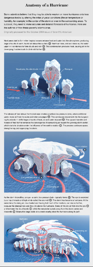一些科学家认为,他们或许能够通过改变飓风中心、甚至是周围环境的原始物理条件(例如空气温度或湿度),来减弱飓风或者把它们引开。为了实现这个目标,他们需要准确而详细的预测数据。在这里,我们简单概述这些强有力的风暴的形成过程。(原文刊载于《科学美国人》2014年10月刊)