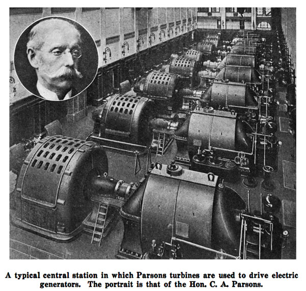 Charles Parsons发明的涡轮动力船。它由数字组装,提供了一种更加高效的驱动电力装置,以及更高效的生产产品。