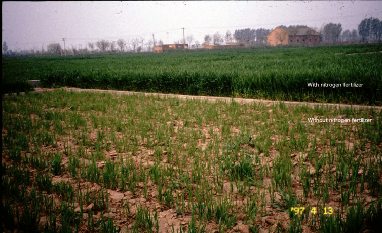 使用氮肥和未使用氮肥的小麦生长对比实况【图上为使用了氨肥,图下为未使用氨肥】。Deli Chen/墨尔本大学