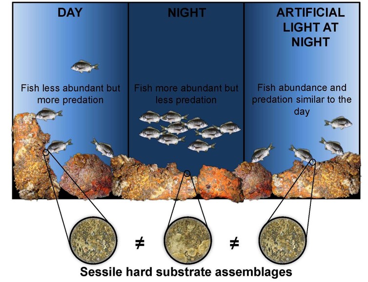 我们利用LED聚光灯对悉尼港一个码头下的光照模式进行操控:为捕食者鱼类照亮附着的食物--无脊椎动物群体(附着在海床以及码头处)。我们记录下了不同光照情境下(白天、夜间、被人造光照亮的夜间)鱼类的数量以及行为。(我们发现)这些无脊椎动物群体要么受到保护,要么暴露于捕食者。