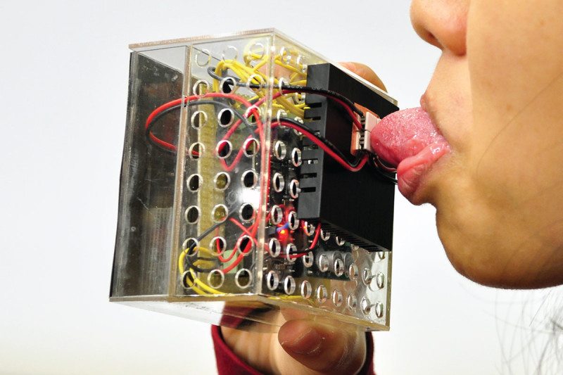 因此Ranasinghe和同事EllenYi-Luen Do 转而研究热刺激。在东京召开的2016国际计算机组织(ACM)软件用户界面与技术会议(UserInterface Software and Technology Symposium ,UIST)上,他们展示了通过温度变化模拟甜味味觉的新项目。当用户伸出舌尖触碰方片状热电元件,它可以通过迅速加热和冷却来误导热敏性神经元,产生味觉的感官编码。