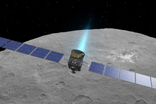 艺术家绘制的黎明号在谷神星上使用离子发动机的概念图。供图:NASA Jet Propulsion Laboratory