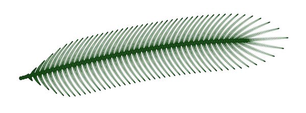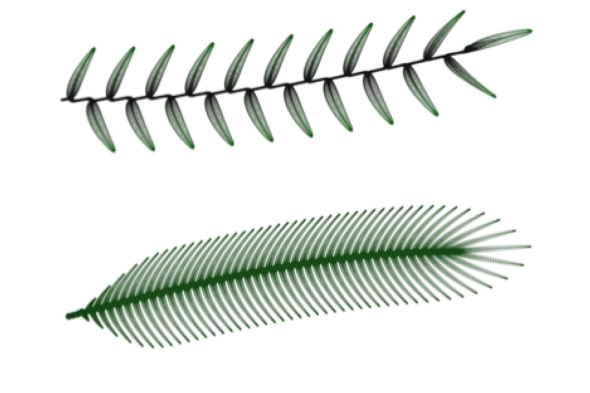 用数学概念构建叶子形状的方法有很多种。一个有名的例子就是巴恩斯利市(Barnsley)的蕨类。生于1946年的著名英国数学家迈克尔·巴恩斯利(Michael Barnsley)在他名为《无处不在的分形》的书中描述了这种美丽的分形结构。他用迭代函数系统的方法创造了这种分形,且其与蕨类植物的叶形十分相似。