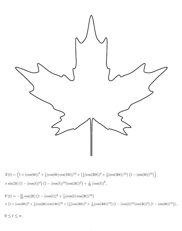 当我想画一个现实物体的时候,我会试着一步一步地找到一个数学公式来进行我的绘画。在每一步中,我都会在函数上增加数学表达式,以此来提升绘画与物体的相似度。通常来讲,我都会去寻找有关正弦和余弦的公式,因为这两个公式的特点(尤其是周期性,有界性和平滑性)会让它们在绘画过程中显得十分有用。然而我还是要在每一步中都找到一个合适的数学表达式,因此有些步骤会显得非常的难,甚至不可能完成。举个例子,在上图中,你可以看到一个类似日本枫叶形状的数学曲线的产生过程。图像显示的就是如何把一个圆变为一个枫叶这样的图形。