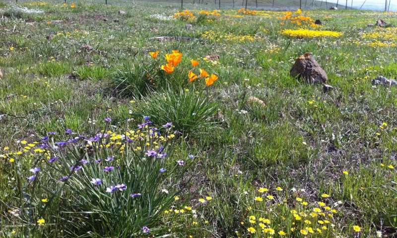 图为加州狼岭(Coyote ridge)实验区中盛放的各种野花,有庭菖蒲(Sisyrinchium)、花菱草(Eschscholzia)、加州小黄菊(Lasthenia)、大花葱(Muilla)等。草原上物种的减少使得剩下植物的花期来得格外早。图片来源:Amy Wolf