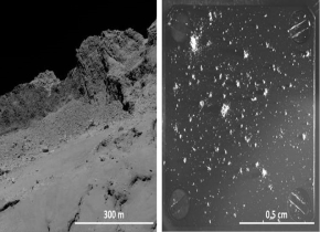 其他仪器,如航载摄像机和VIRTIS成像光谱仪,研究了67P的表面。它的表面结构是复杂的:悬崖,断层,山体滑坡,坑等等。但最重要的是,彗星的表面非常黑暗,并且冰块很少。它太黑的事实可能是由于有机碳含量高。考虑到冰和气体只占整个彗星物质的一小部分,研究人员依靠其他物质对彗星释放的尘埃粒子进行分析,以增进对彗星核构成的了解。这种尘埃是彗星非挥发性成分的代表,对尘埃的化学特性的研究将反映彗星的核心特征。