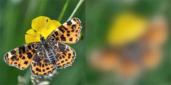 左图展示了一只寻找点心的松鸦眼中蝴蝶翅膀可能看起来的样子。右图展示了该蝴蝶同类,诸如竞争对手或潜在配偶眼中看到的景象。(图片版权:Eleanor Caves)