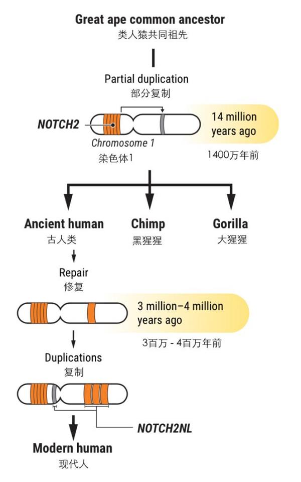 随后,产生活性的NOTCH2NL基因再度复制了两次,在人类染色体1的一端连续产生了三个有活性的NOTCH2NL基因,另一端则产生了一个无活性的复制品。基因复制可以是强有力的进化力量,因为一个复制品会继续它的工作,让其它的基因能够自由地做新的事情。