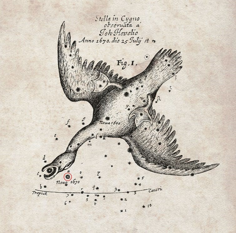 著名的天文学家Hevelius在这幅图中记录了“新星”的位置(红色标记的地方),英国皇家天文学会发表了该发现。CC BY-SA