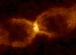 这样沙漏状的双叶表明了来自中心的喷流的存在,它们形成了相对的两个气泡状尘埃环。但是这个沙漏的角度略有不同,暗示了它原始的结构经历了一个持久的旋转过程。不管究竟发生了什么,那都不只是一个单一的爆炸。喷射过程必定花了一些时间。