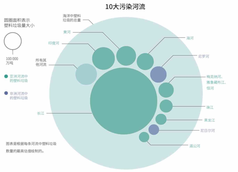 结果表明,每年经这57条河进入海洋的塑料垃圾质量为47万~275万吨(具体数值取决于模型使用的数据)。其中有10条河携带了93%的塑料垃圾,它们是长江、黄河、海河、珠江、黑龙江、湄公河、印度河、恒河三角洲(汇集恒河、雅鲁藏布江、梅克纳河三大水系)、尼日尔河和尼罗河。每年仅长江就有大约150万吨塑料垃圾流入黄海。