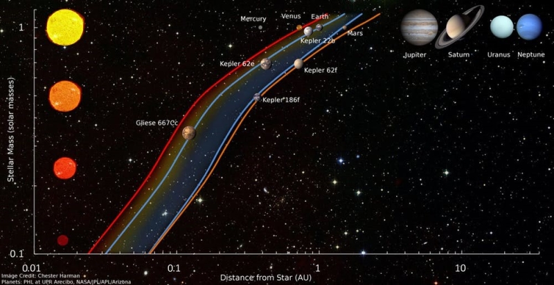 恒星的宜居带(这里显示在橙色和红色之间)最终取决于恒星的亮度和温度。(图片来源:Sonny Harman)