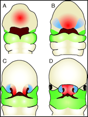 脸的形成示意图。将会发育成鼻子和上唇的组织(红色区域),发育成鼻翼的组织(蓝色区域)以及发育成上下颌的组织(绿色区域)在胚胎发育的第四周出现(A图)。到第八周(D图),这些组织迁移、聚合形成了有基本特征的脸。(图片来源:New insights into craniofacial morphogenesis, CC BY)