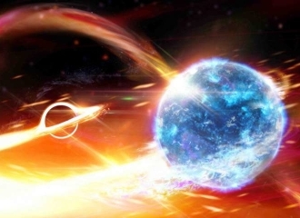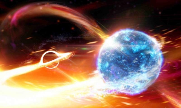 黑洞与中子星相遇的画面是怎样的?没有人能给出确切的答案,但天文学家预测了两种可能的结局:或许,黑洞巨大的引力将中子星撕碎,后者只余下发光的遗骸,一步步被黑洞吞噬,光芒逐渐变得黯淡,直至消失殆尽。另一种可能性是,我们什么都看不见,因为黑洞一口气就将整个中子星吞下。