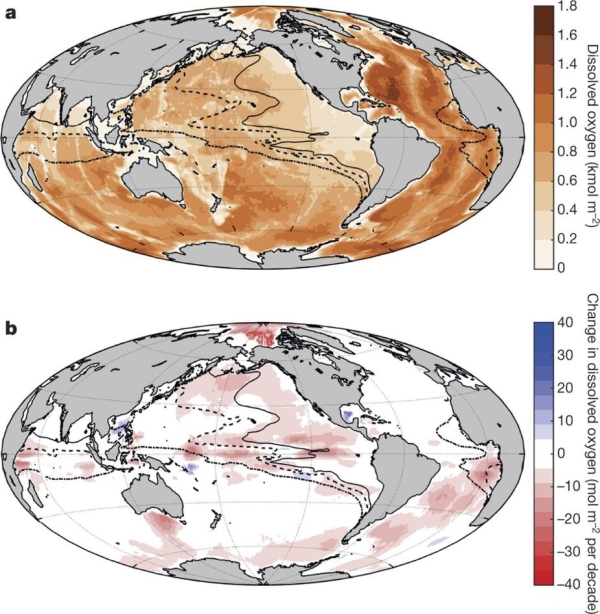 一张显示全球海洋溶解氧含量(a)和十年内变化情况的地图(b)。