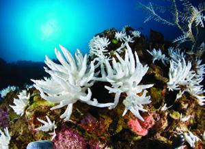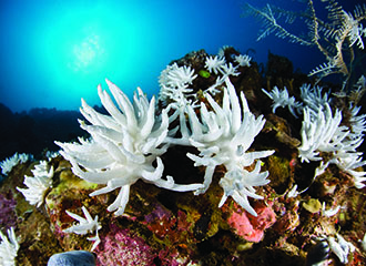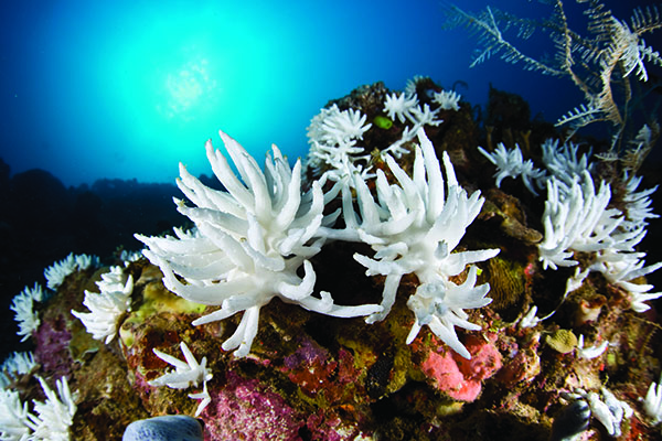 在印度尼西亚的布雅湾,皮革珊瑚已经大片白化。