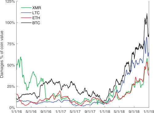 图为2016年1月1日至2018年12月31日期间,在美国生成一枚加密货币造成的人群健康和气候负面影响占该货币价值的比例。注:BTC=比特币,ETH=以太坊,LTC=莱特币,XMR=门罗币。 (图片来源:UNM)