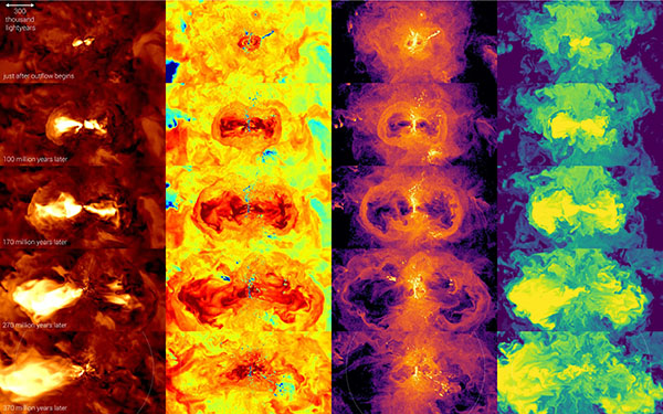 TNG50模拟中其中一个星系周围的气体在数亿年间的演化(由上至下),位于星系中心的是处于活跃状态的超大质量黑洞,其从周围吸收气体,并在此过程中产生了大量能量。这些能量的释放产生了超快速的风,它们迅速离开星系,并膨胀至原大小的数千倍。这些黑洞驱动的外流气体达到了每秒数万公里的极高速度,并具有超过一百万度的极高温度,并携带了大量的重元素,如氧元素、碳元素和铁元素。上图从左到右的四栏分别为星系的周围的外流气体演化速度、温度、密度和重元素分布。该星系是每幅图像正中心的垂直薄片,是一个温度较低(第二栏,蓝色部分),密度较高(第三栏,黄色部分)的产生恒星的气体圆盘。