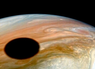 木卫一投在木星上的影子(图片来源:NASA、喷气推进实验室-加州理工学院、美国西南研究院和马林空间科学系统公司)