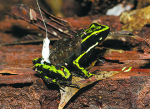帕斯库尼斯及同事们在7只秘鲁三纹毒蛙和11只法属圭亚那染色毒蛙尾部安装了类似尿布的小型无线电发射器。研究人员使用无线电信号记录了毒蛙23次不同的旅程,以及每次蝌蚪爸爸从水域经过或放下蝌蚪时的情景。