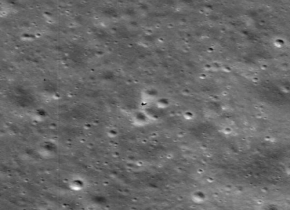 月球背面冯·卡门环形山内的嫦娥四号着陆器(图中心)和月球车(向西北行驶的小黑点),2019年7月1日由美国宇航局的月球勘测轨道飞行器拍摄。图片来源:James Stuby,基于NASA月球勘测轨道相机观测影像
