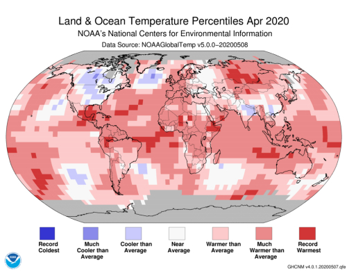 2020年4月,全球海洋温度是有记录以来最高的,全球陆地温度是有记录以来第二高的。根据阿拉巴马汉茨维尔大学(UAH)和RSS的数据,截至2020年4月,经卫星测得的地表垂直向上8公里范围的大气层的温度是42年以来第四高的。