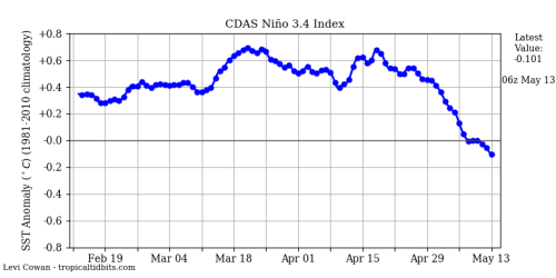 图2.截至到2020年5月13日结束,基准Ni?o 3.4地区(赤道太平洋)的海表温度(SSTs)。在5月的前两周,SSTs接近历史平均水平,即处于中性状态。图片来源:Levi Cowan tropicaltidbits.com