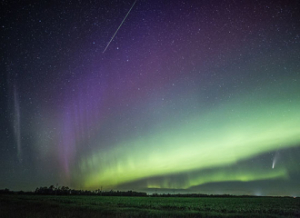 在这张极光大使Donna Lach拍摄的照片中,新智彗星NEOWISE在充满极光的天空中可见。这张照片于2020年7月14日拍摄于加拿大马尼托巴省西部。左边紫色的带状结构STEVE,是在极光项目的民间科学家的帮助下发现的一种与极光有关的现象。靠近图像顶部的明亮条纹是一颗流星。