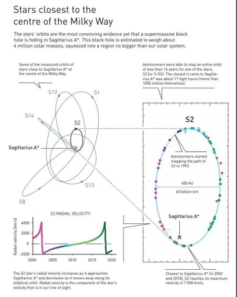 其中一颗叫“S2”(或“S-O2”)的恒星,用不到 16 年的时间围绕银河系中央的轨道完成了一次周转。在这样一个极短的时长内,天文学家得以画出完整的轨道地图。我们可以把这个环绕时长与太阳的相比:太阳围绕银河中心完成一整个环绕需要 2 亿年;在如今这一轮环绕的开端,恐龙还在我们的地球上漫步。
