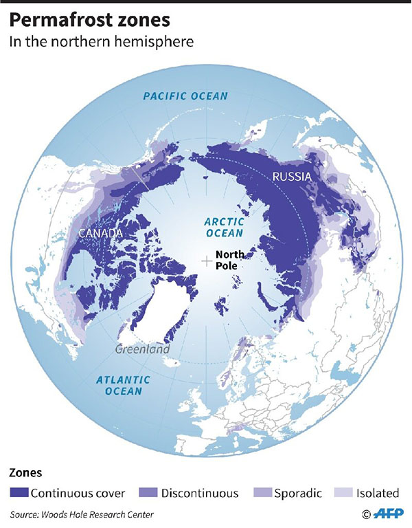 联合国气候科学小组IPCC的数据显示,即使人类设法将全球变暖的上限控制在2摄氏度以下(2015年《巴黎协定》的基本目标),到2100年,永久冻土面积也将减少四分之一。此外,永久冻土里还藏有诸多未知的东西。美国阿拉斯加大学费尔班克斯分校地球物理学教授Vladimir Romanovsky说:“微生物可以在冰冻空间中存活很长一段时间。”