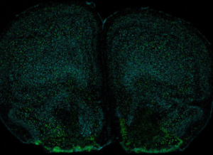 鼠脑的神经元(绿色)上有探查免疫分子IL-17的受体(蓝绿色)。圣路易斯华盛顿大学医学院的研究人员发现了一种由免疫系统产生的分子,它能作用在大脑上从而改变小鼠的行为。图片来源:华盛顿大学医学院
