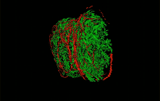 研究人员发现小鼠感觉神经纤维(红色)与淋巴结(绿色)的相互作用。来源:Siyi Huang, John Austin, Najat Mannoun