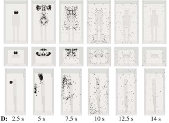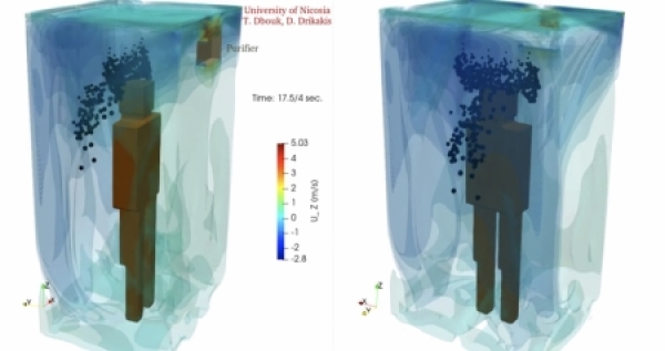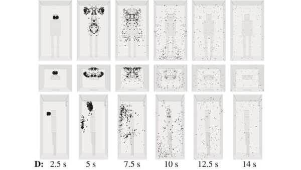 研究者对一个大小相当于一部能容纳5人的电梯的三维空间进行了模拟和计算。假定在空间中的某个位置有人轻度咳嗽,并在不同的位置设置进气口和排气口,以研究它们对空气循环的影响。模拟实验中也包括空气净化器的设置。