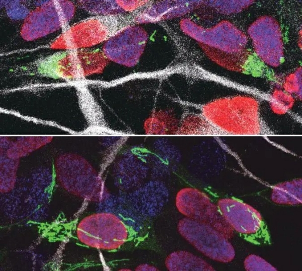 人体祖细胞分裂之后,含有 DNA 的细胞核染成红色,线粒体染成绿色。线粒体发生裂变的细胞分化成神经元(上图),含有管状线粒体的细胞仍然是祖细胞(下图)。祖细胞中的细胞核标记为蓝色,新生神经元标记为白色。图片来源:VIB - Ryohei Iwata
