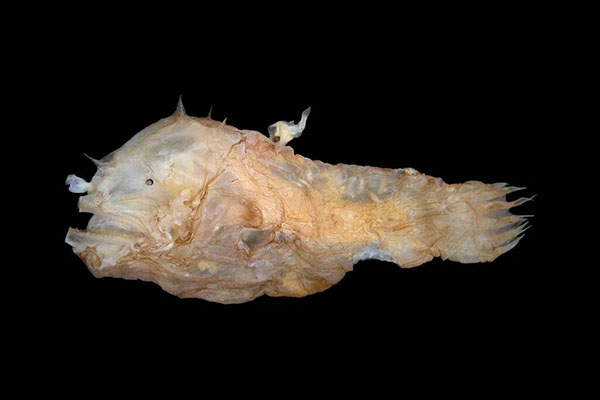 6.2毫米长的雄性鮟鱇鱼寄生融合在46毫米长的雌性鮟鱇鱼背上。 (图片来源:Theodore W. Pietsch/华盛顿大学)